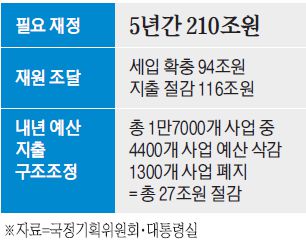 인공지능(AI) 3대 강국(25조원), 지역균형성장(15조원), 복지 강화(24조원) 등 국정기획위원회가 5년간 국정과제 이행에 중앙정부 재정 210조원의 추가 투입이 필요하다고 13일 밝혔다.
