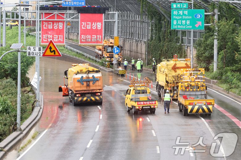 서울 동북·서북권에 호우경보가 발령된 13일 서울 노원구 월계동을 지나 흐르는 중랑천이 범람해 동부간선도로 차량통행이 통제되고 있다. 2025.8.13/뉴스1 ⓒ News1 민경석 기자 |