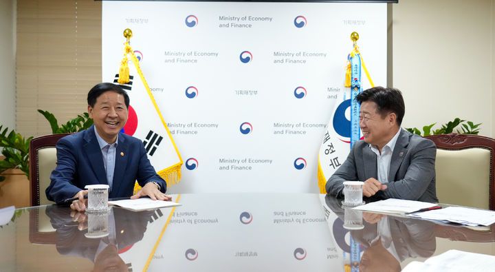 [제주=뉴시스] 구윤철(왼쪽) 경제부총리 겸 기획재정부 장관과 오영훈 제주지사가 13일 오후 정부서울청사에서 면담하고 있다. (사진=제주도 제공) 2025.08.13. photo@newsis.com *재판매 및 DB 금지 |