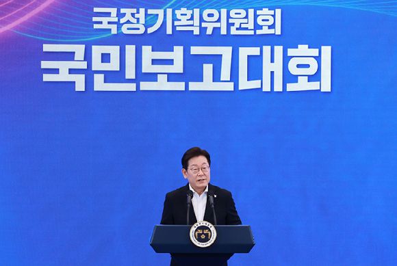 이재명 대통령이 13일 청와대 영빈관에서 열린 국정기획위원회 국민보고대회에서 발언하고 있다. 2025.8.13 [사진=연합뉴스] |