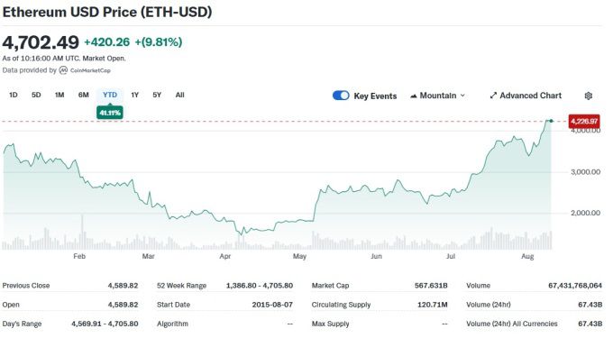한국시간으로 오후 7시 14분 기준 이더리움 가격은 24시간 전보다 9.83% 오른 4695.77달러(코인데스크 기준)에 거래되고 있다. 업비트 기준으로는 640만원 수준에 거래되고 있다. 8월 들어서만 26% 넘게 상승했으며, 이는 비트코인·리플(XRP) 등 다른 주요 코인보다 더딘 상승세를 만회하려는 흐름이라는 분석이 나온다.
