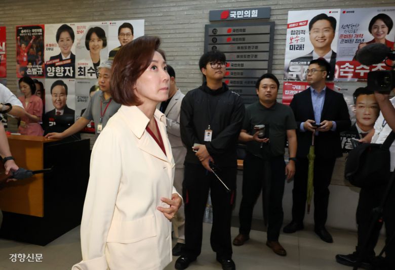 당혹 나경원 국민의힘 의원이 13일 김건희 특검팀의 압수수색이 진행 중인 서울 여의도 중앙당사로 급히 들어서고 있다. 박민규 선임기자 |
