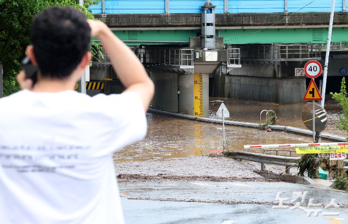 서울 곳곳에 호우주의보가 내린 13일 서울 서대문구 증산교 인근 불광천이 수위가 높아져 출입이 통제되고 있다. 류영주 기자 |