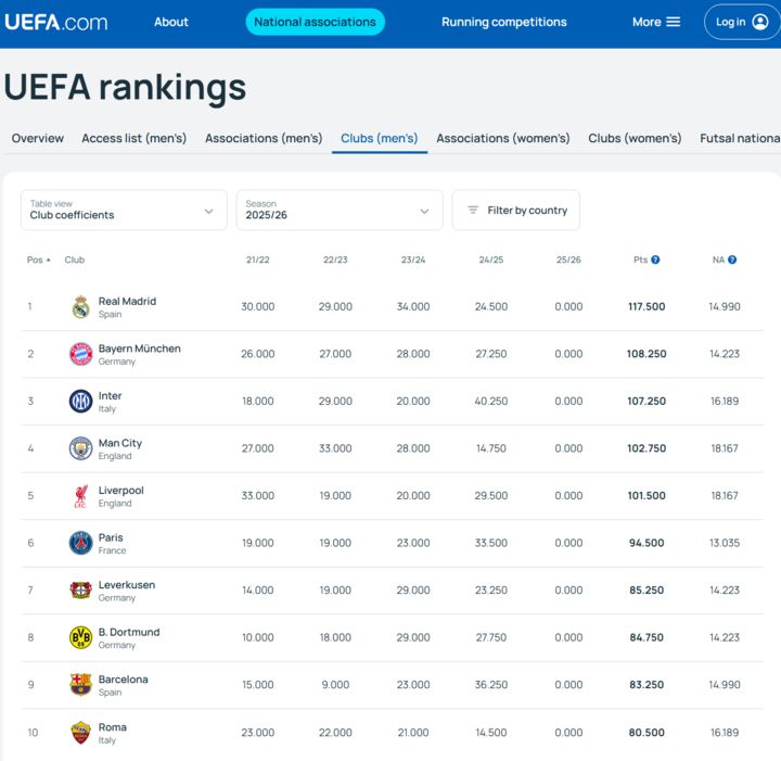 2위 바이에른 뮌헨과 3위 인테르(107.250점)는 근소한 차이로 순위를 다투고 있다. 인테르는 최근 세 시즌 동안 두 번의 결승 진출에 성공하면서 순위를 끌어올렸다.