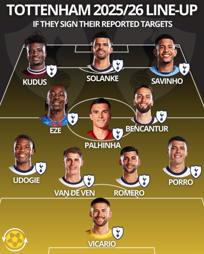 만일 사비뉴와 에제가 토트넘에 합류한다면 아래와 같은 선발 라인업이 완성된다. 먼저 골문은 굴리엘모 비카리오가 지킨다. 데스티니 우도기, 미키 판 더 펜, 크리스티안 로메로, 페드로 포로가 수비를 담당한다.