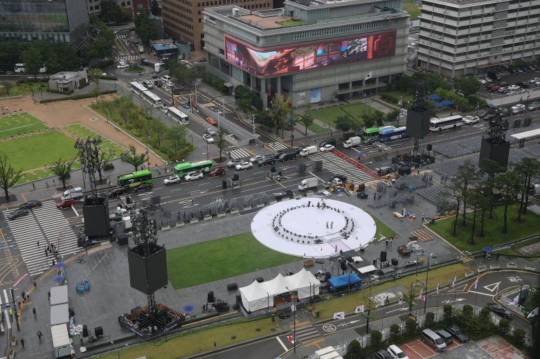 13일 서울 광화문 광장에 설치된 광복절 행사 무대. 대통령실은 광복절 행사와 함께 진행되는 이재명 대통령 국민임명식에 약 1만 명의 국민을 초청할 예정이다. /뉴스1 |