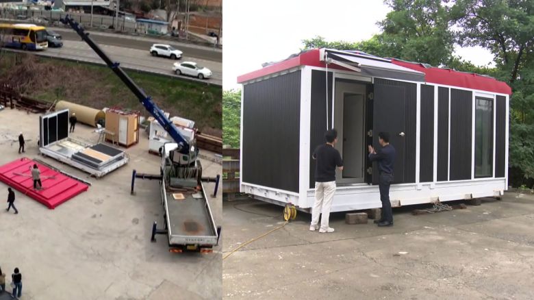 [오근영 / 한국건설기술연구원 수석연구원 : 접이식 구조를 스윙 벽체를 개발해서 적용했는데요. 스윙 벽체가 펼쳐지고 그다음에 탈부착 가능한 욕실이랑 주방을 장착하고 지붕까지 얹혀져서 구조체가 전체 완성되는 데까지 90분 정도 소요되고요.]