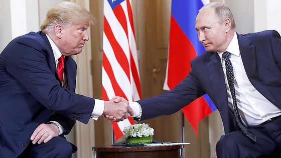 2018년 7월 16일(현지시간) 핀란드 헬싱키 대통령궁에서 도널드 트럼프(왼쪽) 미국 대통령과 블라디미르 푸틴 러시아 대통령이 회담을 시작하며 악수를 하고 있다. AP=연합뉴스 |