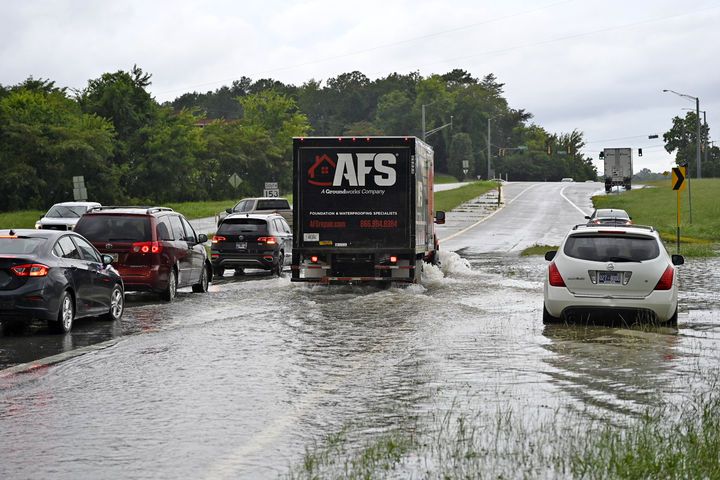 [채터누가( 미 테네시주)= AP/뉴시스] 테네시주를 강타한 역대급 폭우와 돌발 홍수로 8월 12일 채터누가의 간선도로의 차들이 침수된 도로를 조심스럽게 지나가고 있다. 2025. 08.14.