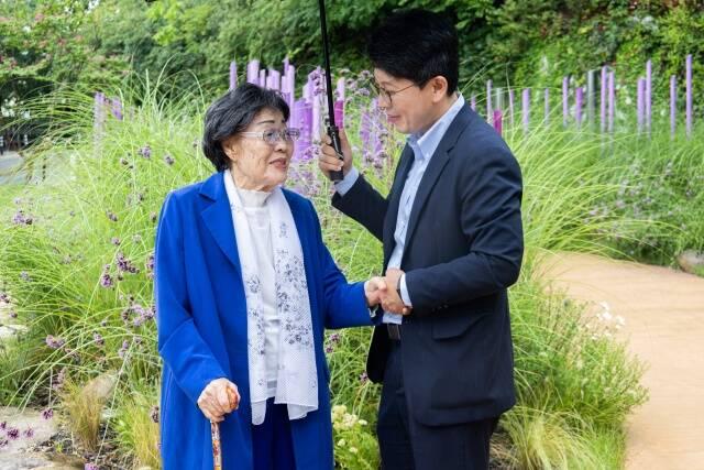 김병민 서울시 정무부시장이 13일 이용수 할머니와 함께 지난 7월 재조성된 ‘기억의 터’를 둘러보고 있다. /서울시