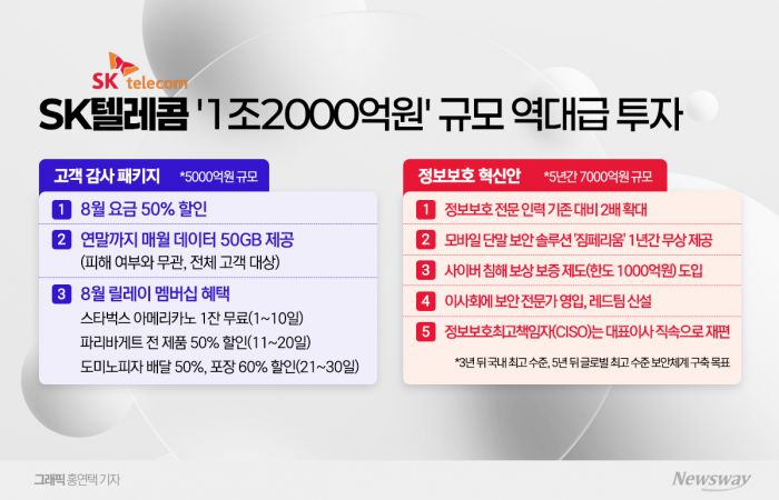 SK텔레콤은 지난 7월 요금 50% 할인, 매월 50GB 데이터 제공, 멤버십 최대 60% 할인 등의 혜택을 담은 총 5000억원 규모의 '고객 감사 패키지'를 발표했다. 여기에 향후 5년간 7000억원을 투입해 세계 최고 수준의 사이버 보안 체계를 구축하겠다고 약속했다.