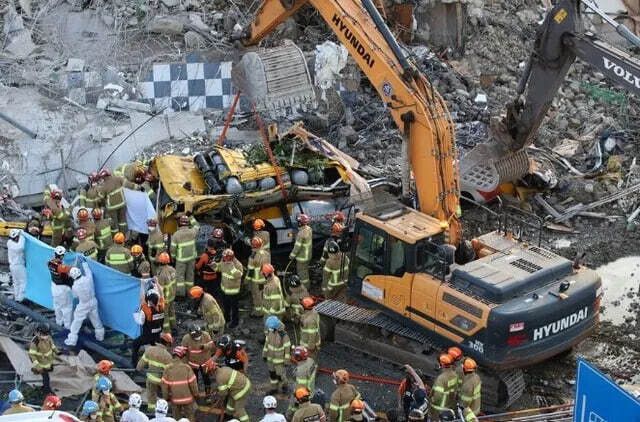 2021년 6월9일 오후 광주광역시 동구 학동에서 철거 중인 건물이 무너지며 지나가는 시내버스를 덮쳐 119구조대원들이 현장을 수습하고 있다. 연합뉴스
