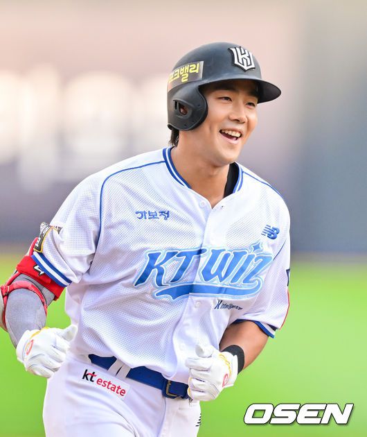 [OSEN=수원, 박준형 기자] 9일 오후 수원 KT위즈파크에서 ‘2025 신한 SOL BANK KBO리그’ KT 위즈와 삼성 라이온즈의 경기가 진행됐다.이날 KT는 헤이수스를 , 삼성은 가라비토를 선발투수로 내세웠다.2회말 1사 1,2루 KT 장진혁이 역전 3점 홈런을 날리고 베이스를 도고 있다. 2025.08.09 / soul1014@osen.co.kr |