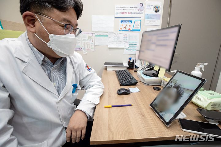 [서울=뉴시스] 최동준 기자 = 지난 2023년 5월 30일 백재욱 도봉구의사회 총무이사가 서울 도봉구의 한 병원에서 비대면진료 시범사업 관련 비대면진료 실행 과정을 시연하는 모습 (공동취재사진) 2023.05.30. photo@newsis.com |