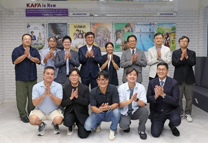 최휘영 문화체육관광부 장관이 14일 서울 마포구 영화진흥위원회 영화교육지원센터에서 영화계 소통 간담회를 마치고 기념 촬영을 하고 있다.