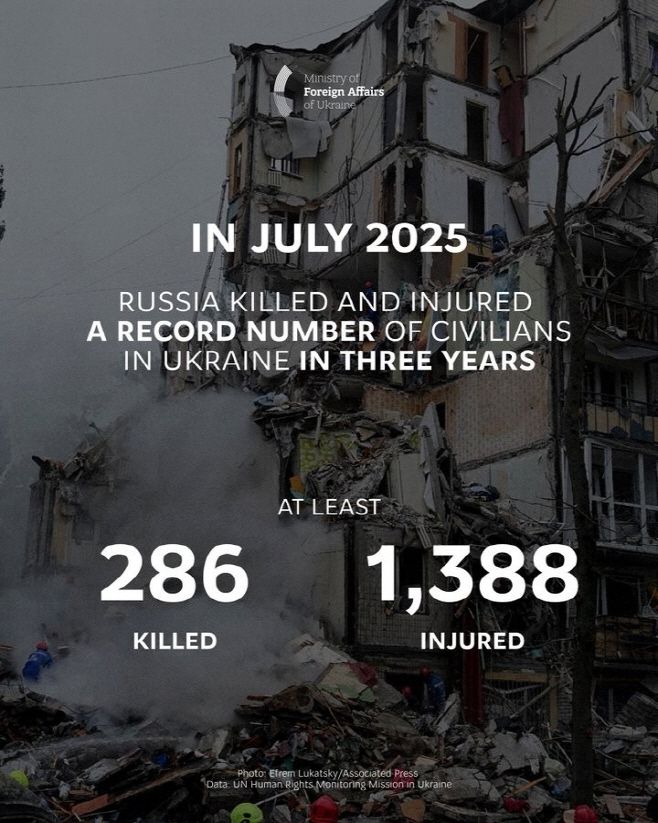 우크라이나 민간인 사상자 규모는 2022년 5월 이후 가장 많은 것으로 집계됐다. 안드리 시비하 우크라이나 외무장관은 "러시아의 미사일·드론·폭탄 공격으로 민간인이 사망하고 있다"며 "심지어 가정과 병원에서도 벌어지고 있다"고 우려했다. 그러면서 "(러시아는) 이러한 전쟁 범죄에 대한 책임을 피하기 어려울 것"이라고 지적했다.