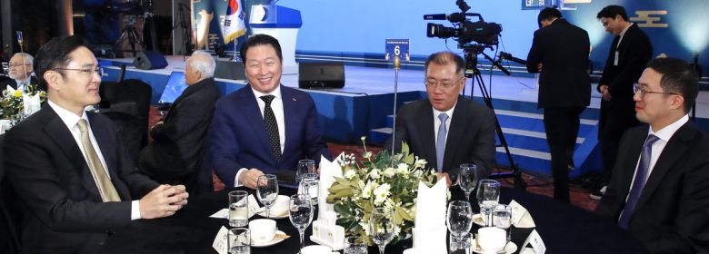 왼쪽부터 이재용 삼성전자 회장, 최태원 SK그룹 회장, 정의선 현대그룹 회장, 구광모 LG그룹 회장이 2019년 1월 서울 영등포구 여의도에서 열린 신년회에 참여하고 있다. 연합뉴스 |