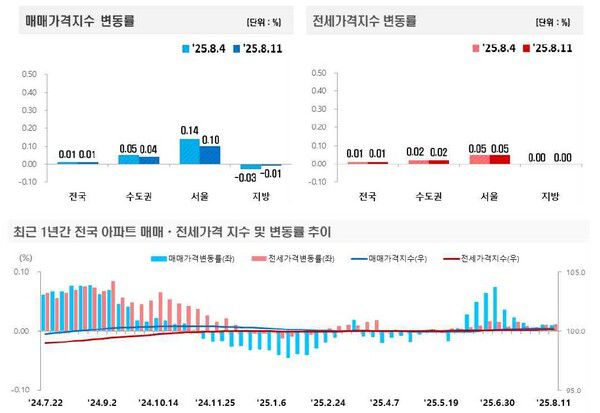 한편, 아파트 전셋값은 전국 평균 0.01% 상승으로 직전주와 같았다. 서울(0.05%)과 수도권(0.02%)은 상승률이 유지됐고, 지방은 0.00%로 보합세를 보였다.