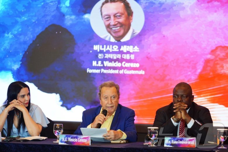 (서울=뉴스1) = 14일 서울 롯데호텔에서 개막한 ‘원코리아국제포럼’에서 비니시오 세레소(Vinicio Cerezo) 전 과테말라 대통령이 연설하고 있다. 왼쪽부터 올린다 살게로 글로벌피스재단 중앙 아메리카 지역 대표, 바니시로 세레소 괴테말라 대통령, 이카나 프레드릭 루술리(Ikana Fredrick Lusuli) 케나 국회의원의 모습이다. (2025 원코리아국제포럼 제공. 재판매 및 DB 금지) 2025.8.14/뉴스1