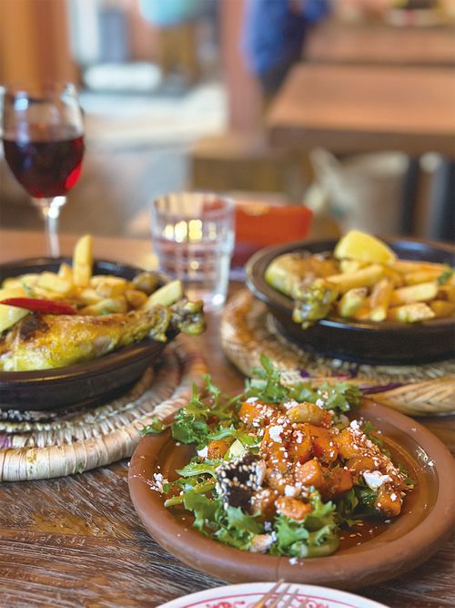 대표 메뉴인 양고기 타진은 미트볼 형태로 제공되며, 토마토 베이스 소스와 계란이 어우러진 진한 풍미가 특징이다. 양고기 특유 향이 거의 없고, 토마토 향신료와 조화가 훌륭한 요리다. 레몬 치킨 타진은 큼직한 닭다리가 레몬, 올리브, 감자튀김과 함께 타진 냄비에 담겨 나온다. 겉은 바삭하고 속은 촉촉해, 뼈가 그냥 분리될 정도로 부드러워 씹을수록 감탄하게 만드는 식감이다. 비건 옵션도 가능한 모로코 오버라이스는 쌀밥 위에 치킨, 양고기, 새우 중 토핑을 고를 수 있다. 당근 샐러드는 꼭 먹어봐야 하는 메뉴로 당근에 아몬드와 치즈, 치커리 등이 어우러진 달콤한 샐러드다.
