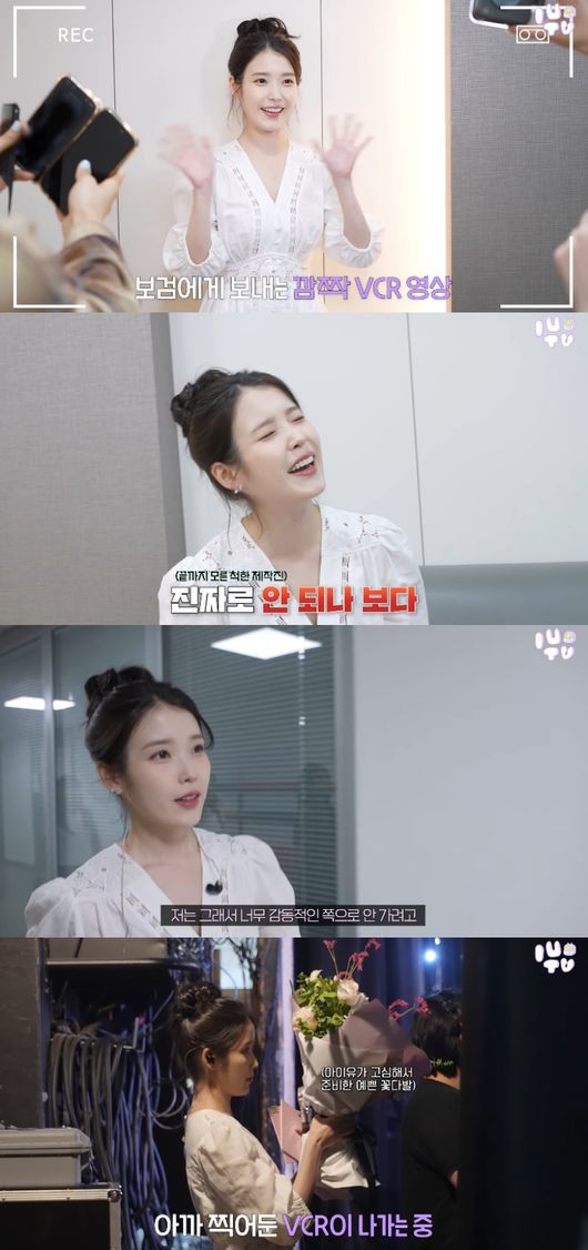 이날 아이유는 ‘박보검의 칸타빌레’ 서프라이즈 이벤트 비하인드를 공개했다. 몰래 대기실을 찾은 아이유는 영상 편지 녹화를 시작으로, ‘칸타빌레’ 작가와 작전회의를 했다.