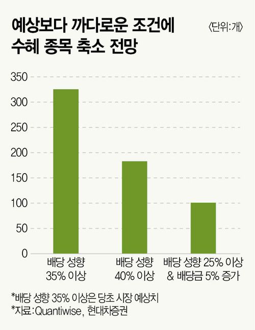 현재 조건으로는 배당소득 분리과세 기준을 넘지 못하지만 향후 충족 가능성이 높은 종목에도 관심이 쏠린다. 증권사들은 저마다의 기준으로 조건을 충족할 만한 종목을 선별했다.