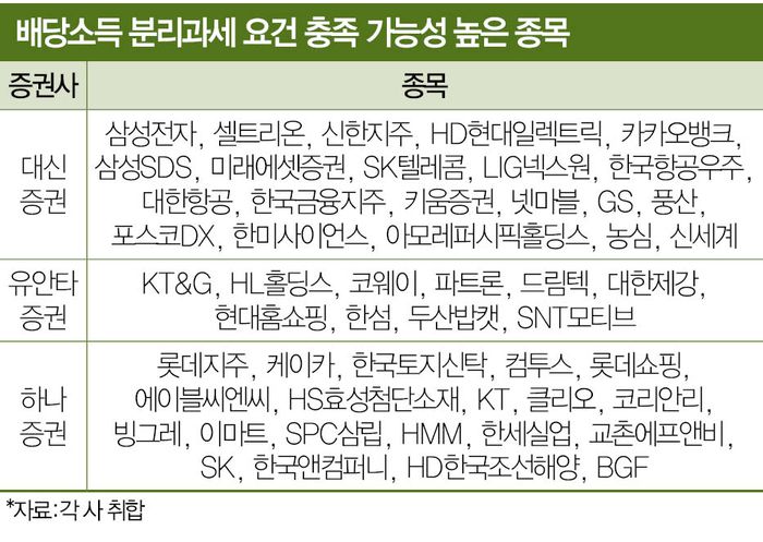 대신증권은 향후 분리과세 요건을 만족할 만한 후보로 삼성전자·셀트리온·신한지주·HD현대일렉트릭·카카오뱅크·삼성SDS·미래에셋증권·SK텔레콤·LIG넥스원·한국항공우주·대한항공·한국금융지주·키움증권·넷마블·GS·풍산·포스코DX·한미사이언스·아모레퍼시픽홀딩스·농심·신세계·HL만도를 꼽았다.