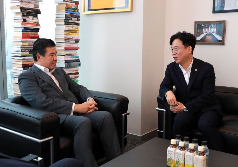 제임스 김(왼쪽) 주한미국상공회의소(암참) 대표이사 겸 회장과 김영훈 고용노동부 장관이 14일 오후 서울 여의도 암참 사무실에서 대화를 나누고 있다. [주한미국상공회의소 제공] |