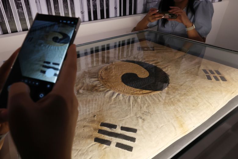 서울 덕수궁 돈덕전에서 열리는 ‘빛을 담은 항일유산’ 전시장에서 관람객들이 ‘서울 진관사 태극기’를 휴대전화로 찍고 있다. /뉴스1