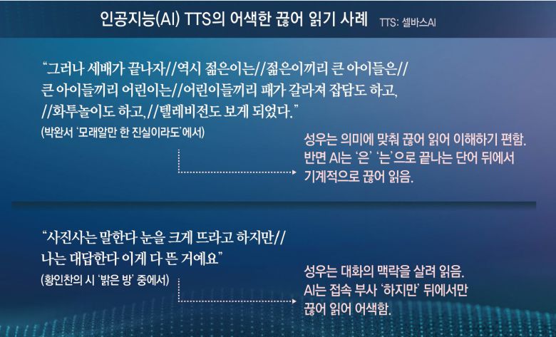 독자들은 이 구절이 사진사와 ‘나’의 문답이며, 쉼표와 마침표가 없어도 띄어 읽어야 한다는 것을 자연스럽게 인지한다. 하지만 AI TTS는 통으로 붙여 읽었다. 사투리에도 약했다. 특유의 억양을 생략한 채 표준어처럼 읽었다. 한 전자책 업계 관계자는 “AI TTS가 아직 의미를 구별하는 데는 한계가 있다”며 “우리는 ‘세계보건기구(WHO)’라고 하면 WHO가 세계보건기구의 약자라는 걸 알지만, AI TTS로 돌리면 ‘후’라고 읽는다. 회사 이름 ‘3M’도 ‘3미터’라고 읽는 식”이라고 했다.