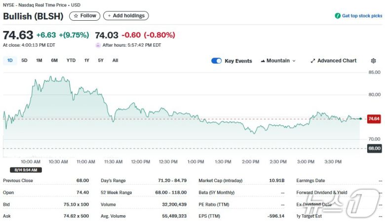 14일(현지 시각) 뉴욕증시에서 불리시는 9.75% 급등한 74.63달러를 기록했다.