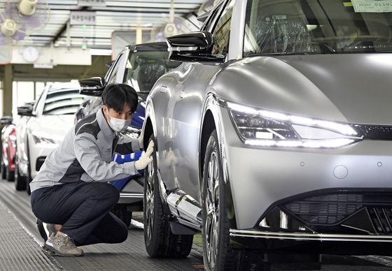 경기 화성에 위치한 기아 공장 '오토랜드 화성'에서 근로자가 완성된 전기차 'EV6'를 검수하는 모습<자료사진>(기아제공·사진은 기사 내용과 무관함).