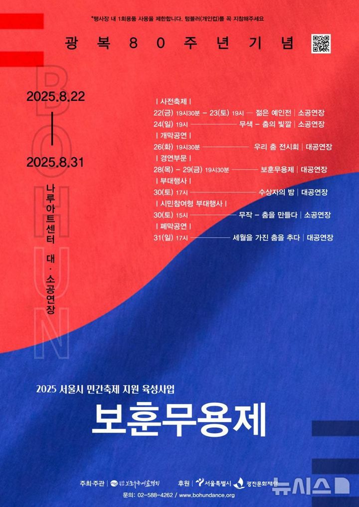 [서울=뉴시스] 최희정 기자 = 보훈무용예술협회가 오는 22일부터 31일까지 나루아트센터 대·소공연장에서 광복 80주년 기념 '2025 보훈무용제'를 연다. 이번 축제는 서울특별시 민간축제 지원 육성 사업의 일환으로 열린다.