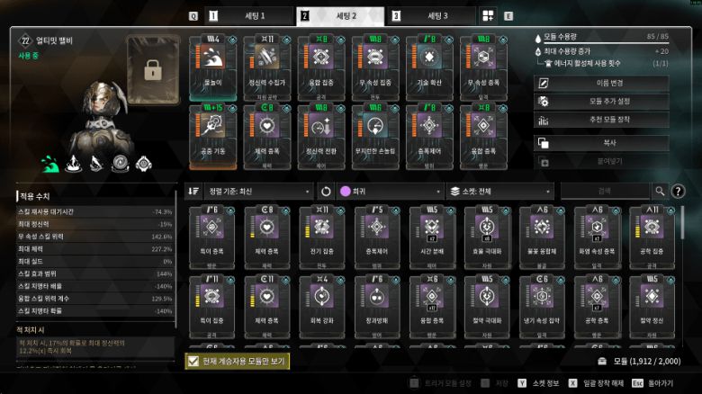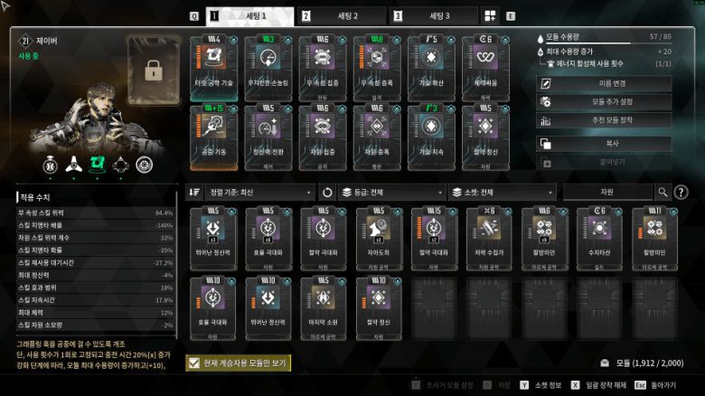 계승자 모듈: 터릿 공학 기술(초월 모듈), 공중 기동(보조 모듈), 부지런한 손놀림, 정신력 전환, 차원 증폭, 차원 집중, 무 속성 집중, 무 속성 증폭, 기술 확산, 기술 지속, 체력싸움, 절약 정신