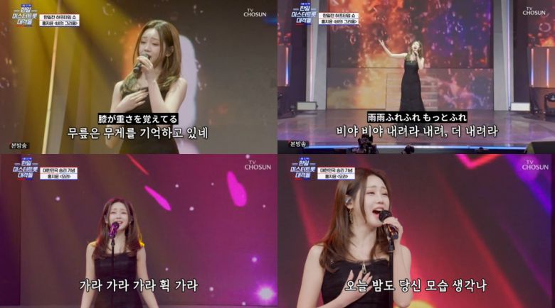 한일 '미스터트롯' 대격돌 결과 '팀 코리아'가 최종 승리를 거두면서 홍지윤은 축하 무대로 '오라'를 선보였다. 홍지윤은 밝은 기운과 청아한 목소리로 치열했던 대결의 대미를 화려하게 장식했다.