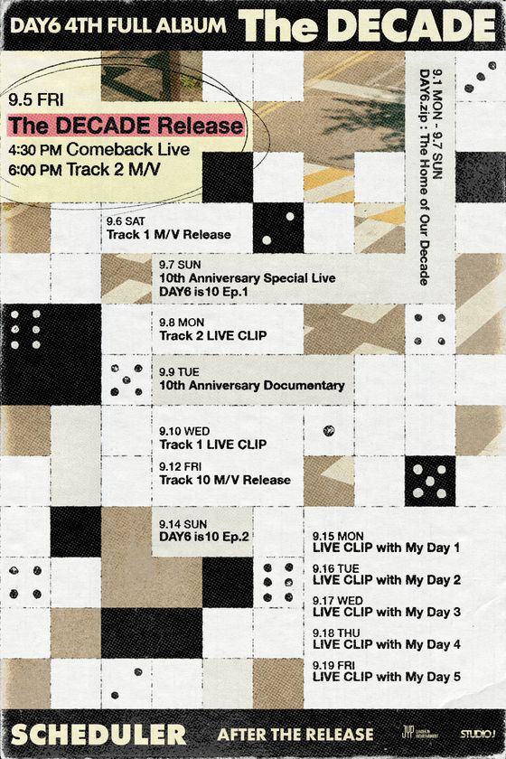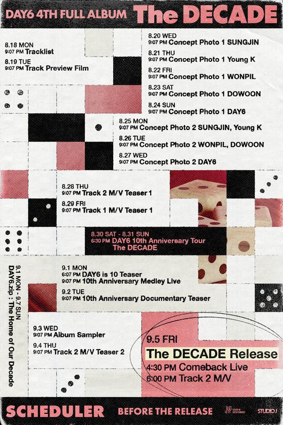 스케줄러에 따르면 오는 18일 트랙리스트를 시작으로 19일 트랙 프리뷰 필름, 20일부터 27일까지 콘셉트 포토, 28일과 29일 두 트랙 뮤직비디오 첫 티저가 순차 오픈된다. 30일과 31일에는 전회차 전석 매진을 기록한 경기 고양시 고양종합운동장에서 데뷔 10주년 기념 투어 'DAY6 10th Anniversary Tour 〈The DECADE〉' 일환 단독 공연을 개최하고 내달 1일 데뷔 10주년 기념 자체 콘텐츠 'DAY6 is 10'(데식은 열 살) 티저와 메들리 라이브, 2일 다큐멘터리 티저가 게재된다. 3일 앨범 샘플러와 4일 두 번째 트랙 뮤직비디오 추가 티저, 발매 당일인 5일 오후 4시 30분 컴백 라이브를 진행한다.