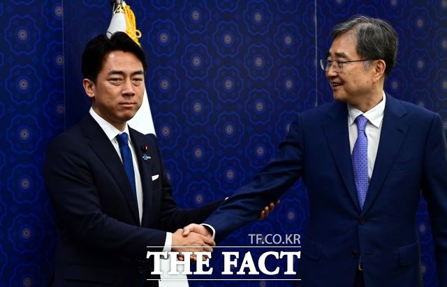 일본 차기 총리 후보로 거론되는 고이즈미 신지로 일본 농림수산상(왼쪽)이 광복절이자 일본의 패전일인 15일 야스쿠니 신사를 참배했다. 사진은 지난 11일 서울 외교부 청사에서 조현 외교부 장관과 만난 고이즈미 신지로 일 농림수산상의 모습. /임영무 기자 |