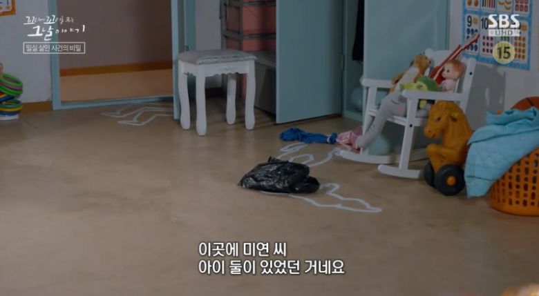 사건이 벌어졌던 미연 씨네 작은 방을 재연했어. 확인 결과, 아이들을 죽이는데 쓴 보자기와 비닐봉지는 원래 미연 씨네 집에 있었던 걸로 확인됐어. 단서를 남기지 않기 위해 범인이 미연 씨네 집에서 범행도구를 구한 거지. 그럼 미연 씨는 어디서 어떻게 살해된 걸까.