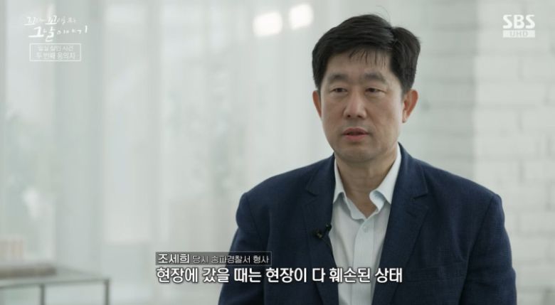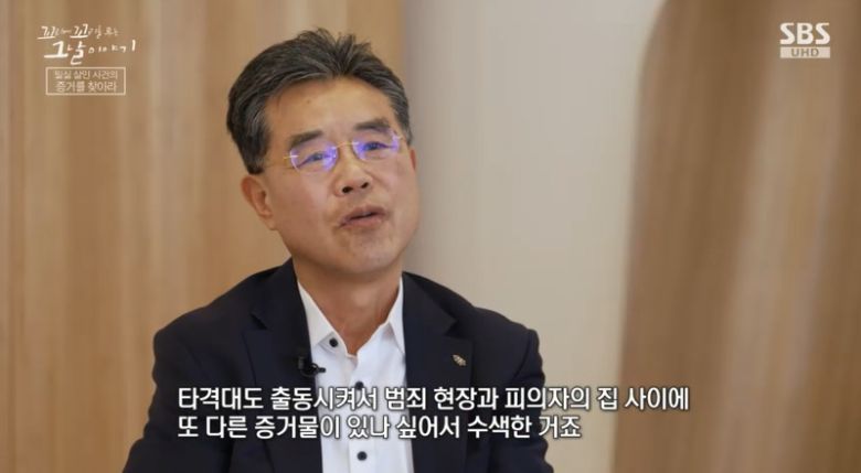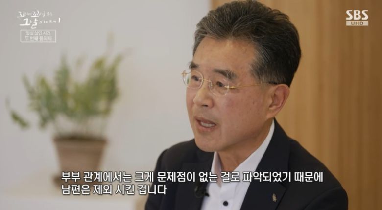 "강력반 중 1개 반을 남편에게 집중적으로 투입해 조사하니, 회사에서 일을 하고 있는 걸로 알리바이를 입증해 줄 사람을 찾았고. 또한 이 집에 싸움이 있었느냐 없느냐, 그런 것까지 다 조사를 하기 때문에 부부관계에서는 크게 문제점이 없는 걸로 파악되었기 때문에, 남편은 제외시킨 겁니다."