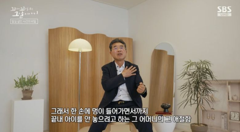 "제가 잔인한 범죄라고 말하는 게, 어떻게 보면 엄마의 모성을 이용한 겁니다. 자기가 죽어가면서도 아이를 혹시 놓칠까 싶어서 두 손으로 저항하지 않고 한 손으로 몸부림치다 보니까. 아이를 안고 있는데 아이가 떨어지면 안 되니까. 그래서 한 손에 멍이 들어가면서까지 끝내 아이를 안 놓으려고 하는 그 어머니의 애절함. 그게 사실상 저는 이 사건의 가장 가슴 아픈 면인데. 의도적으로 연출해서 그것을 이용하는 가해자의 치밀함, 잔인함…"