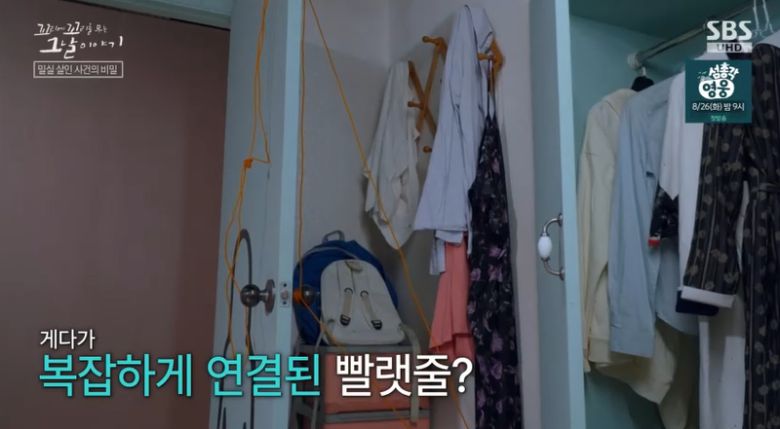 한 씨는 방문 앞에서 미연 씨의 목에 빨랫줄 올가미를 걸고 방문 뒤에서 줄을 잡아당긴 걸로 보여. 그 후에 자살로 위장하기 위해서 빨랫줄을 옷장 고리에 묶어 놓았어.