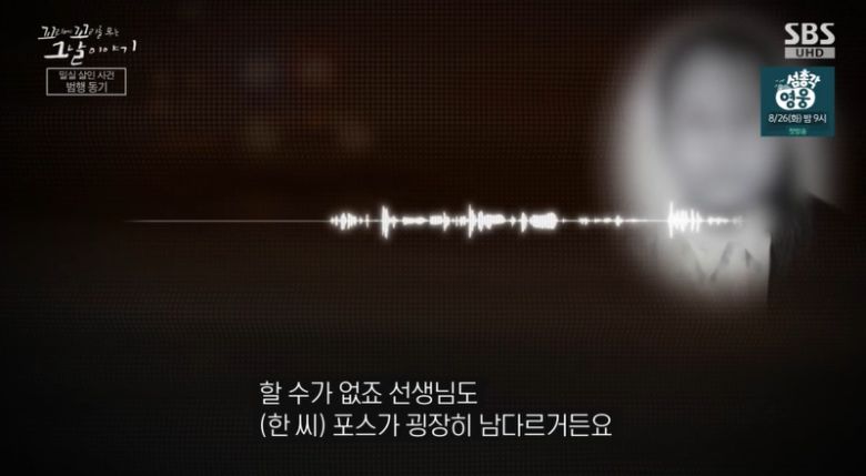 "한 씨 진술은 어차피 그 피해자가 사망하고 나면 아이들이 힘들게 자랄 것으로 생각해서, 자기는 '배려해주었다'는 주장을 하는 거예요. 그런 이야기 했을 때 제가 느끼는 면담 시에 태도와 표정은, 상당 부분 이 범인은 실제로 이렇게 생각하고 있구나, 판단했어요. 이 피해자 남편이 가지고 왔던 삶의 무거운 짐들을 '내가 다 해결해주는 거야'라고 생각했을 가능성이 높습니다."