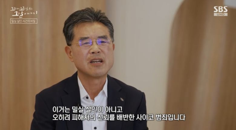"밀실 살인이란 게 그만큼 추리가 더 들어가는데, 그만큼 환경을 꾸밀 만한 살인자의 능력도 안 되고요. 이 사건의 본질이 잘못 알려진 것이고, 그냥 밀실 살인, 사람들의 호기심에 그치잖아요. 이거는 밀실 살인이 아니고, 오히려 피해자의 신뢰를 배반한 사이코 범죄입니다."