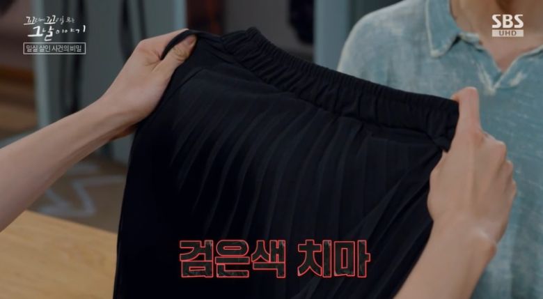 한 씨는 현우를 살해한 후, 현우의 시신을 벽장 안에 숨긴 뒤, 작은방 방문에 올가미를 설치해. 그리고 다음 계획을 실행했어. 한 씨는 안방에 있는 미연 씨에게 검은색 치마를 건넸어.