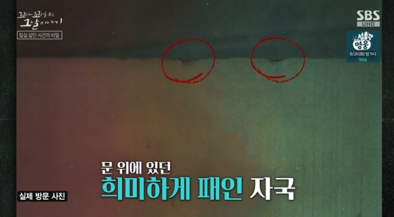 근데 한 씨의 손에 선명한 줄 자국이 있었잖아? 손에도 그 정도 자국이 남았다면, 문에도 자국이 남지 않았을까? 실제로 문 위에는 희미한 자국이 있긴 했어. 근데 홈의 깊이가 얕아. 성인 여성을 억지로 매달아 당겼다면, 깊은 홈이 여러 방향으로 남아 있을텐데. 그렇게 보기엔 자국이 얕고 희미해.