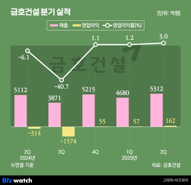 올해 시공능력평가 24위 금호건설이 지난 2분기 162억원의 영업이익을 기록하며 전년 동기 대비 흑자 전환했다. 지난해 1800억원 넘는 영업 적자를 냈지만 지난해 4분기 이후 3개 분기 연속 흑자를 이어와 본격적인 회복세에 들어섰다는 분석이 나온다.