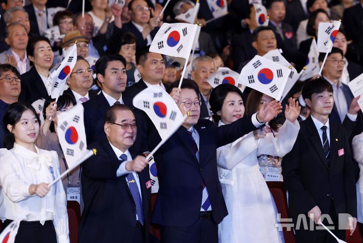 [서울=뉴시스] 최동준 기자 = 이재명 대통령과 김혜경 여사가 15일 서울 종로구 세종문화회관에서 열린 제80주년 광복절 경축식에서 참석자들과 태극기를 흔들고 있다. 2025.08.15. photocdj@newsis.com |