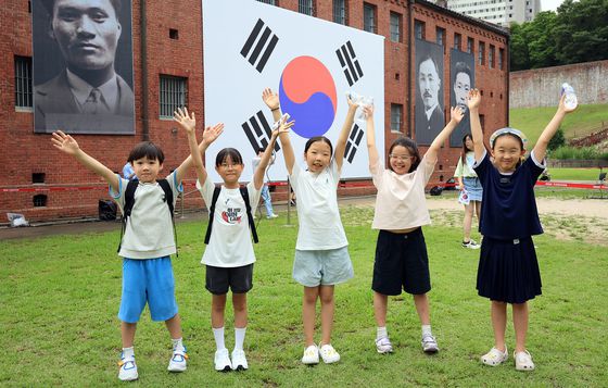 제80주년 광복절인 15일 서울 서대문형무소역사관을 찾은 어린이들이 대형 태극기와 독립운동가들의 얼굴이 담긴 현수막 앞에서 '대한독립만세'를 외치고 있다. 뉴스1 |