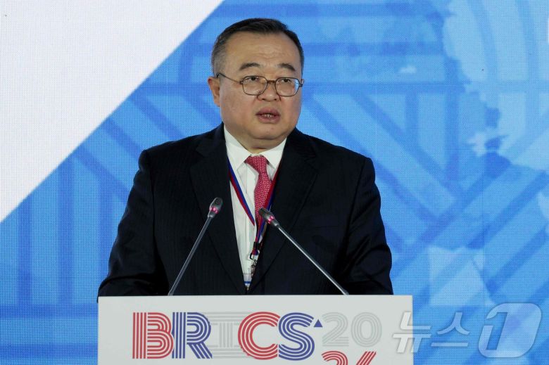 류젠차오 중국 공산당 대외연락부장이 17일(현지시간) 러시아 블라디보스토크에서 열린 브릭스와 파트너 국가들의 포럼에 참석해 연설을 하고 있다. 2024.06.18 ⓒ AFP=뉴스1 ⓒ News1 우동명 기자 |