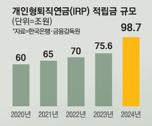 금융감독원의 ‘2024년도 퇴직연금 적립금 운용현황 분석’에 따르면 IRP에 쌓인 돈(적립금)은 98조7000억원이다. 2023년보다 30.6%(23조1000억원) 급증한 것을 감안하면 올해 100조원 돌파가 확실시된다.